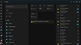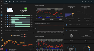 etwas detailierter als die anzeige auf dem ipad im flur: das wetter dashboard mit daten vom dwd und vielen verschiedenen custom cards. am nützlichsten finde ich die zwei tage und wochen-vorhersage per apex charts. die mondanzeige hab ich mir selbst gebaut, die daten kommen aus der regulären mond-integration. die horizon card oben rechts, die den sonnen und mondstand visualisiert finde ich auch sehr nützlich.